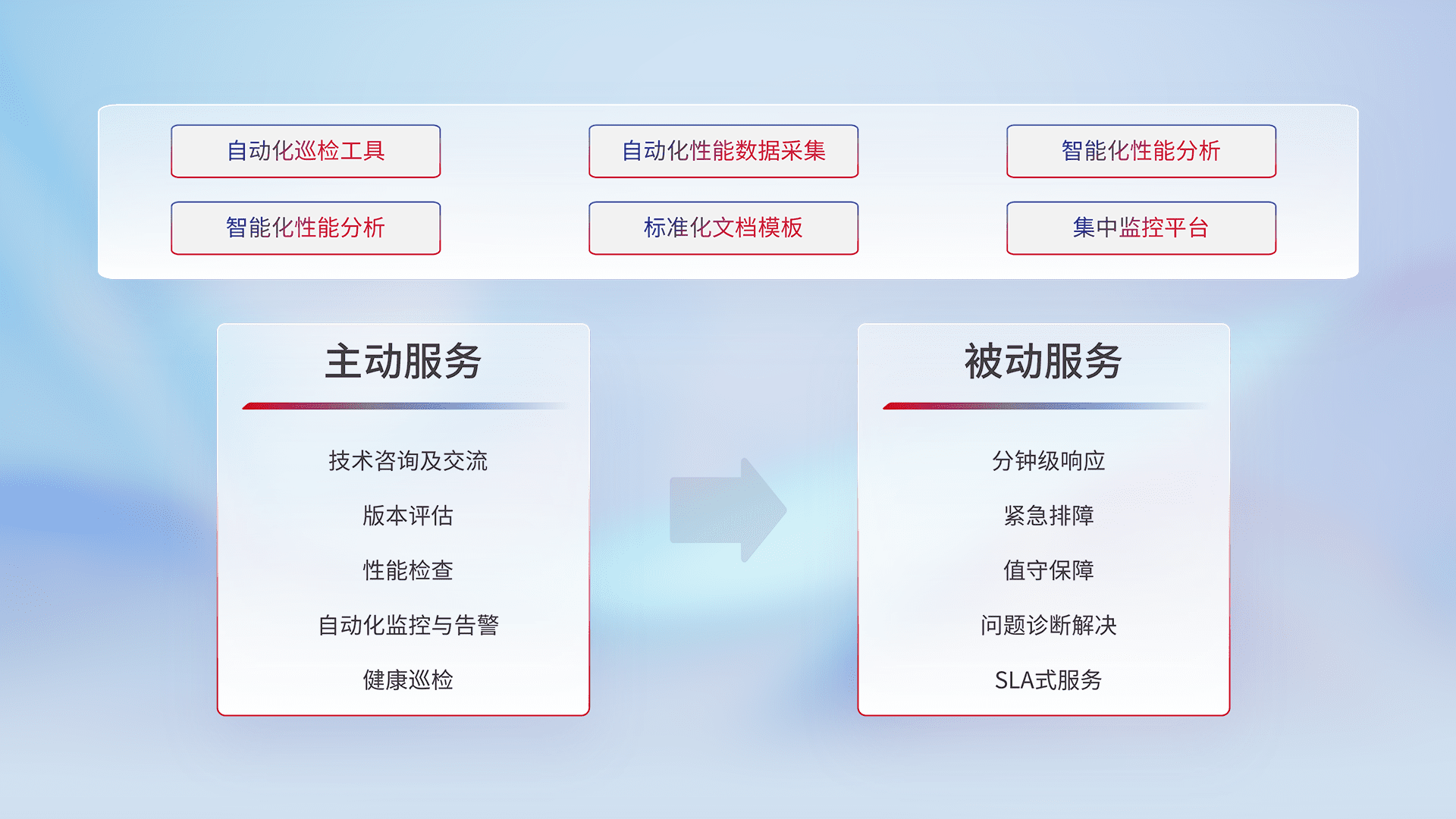 智能化工具和标准化文档,,,,保障服务质量,,提供主动服务(包含技术咨询、、、、版本评估、、、、性能检查、、、自动化监控与告警、、、健康巡检)和被动服务包含(分钟级响应、、、紧急排障、、、、值守保障、、问题诊断解决、、、SLA服务)。。。