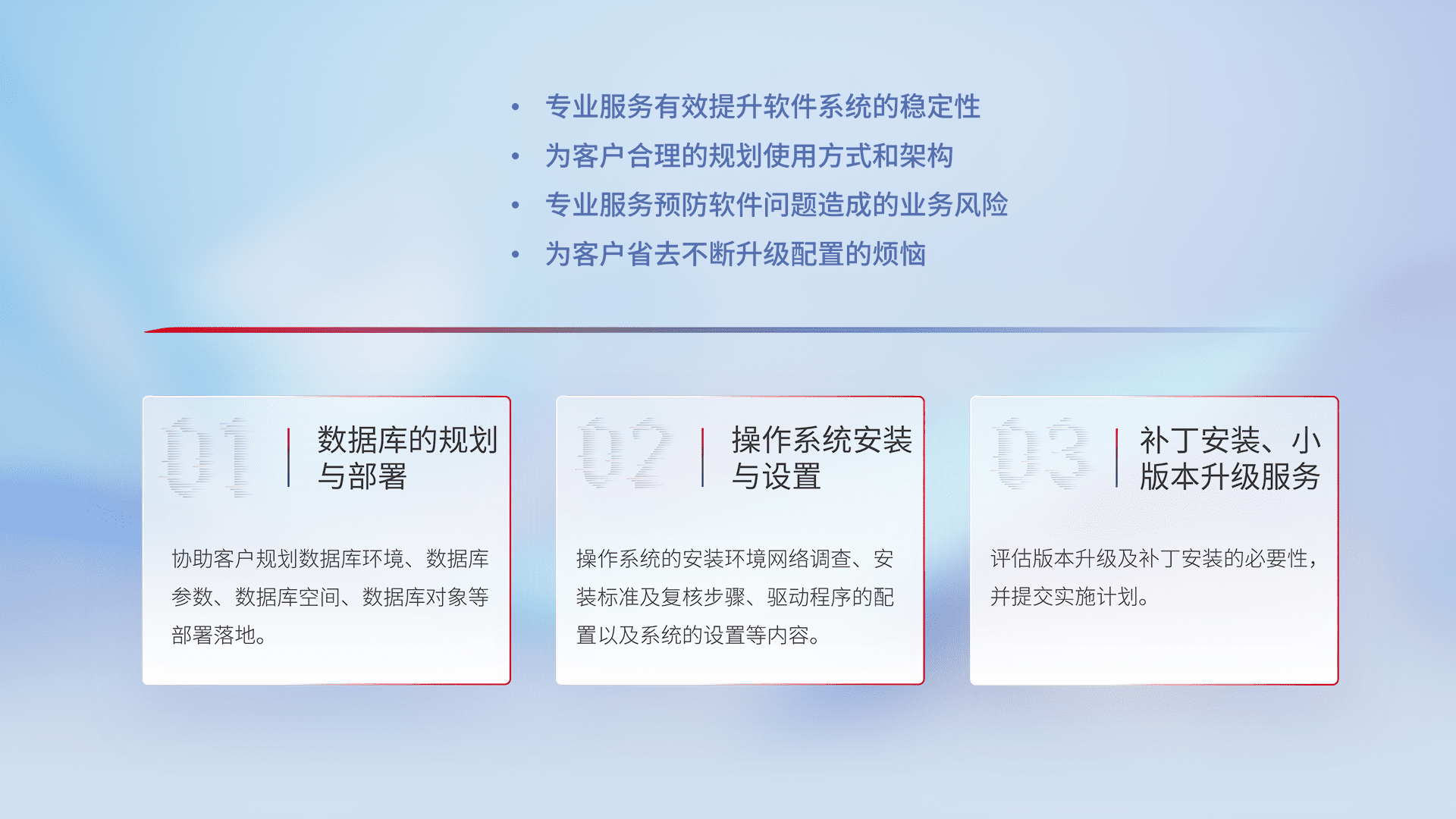 为客户提供软件规模升级、、快速部署、、按需配置的专业服务,,从数据库的规划与部署到操作系统的安装与设置,,,再到补丁安装和小版本升级提供支持。。
