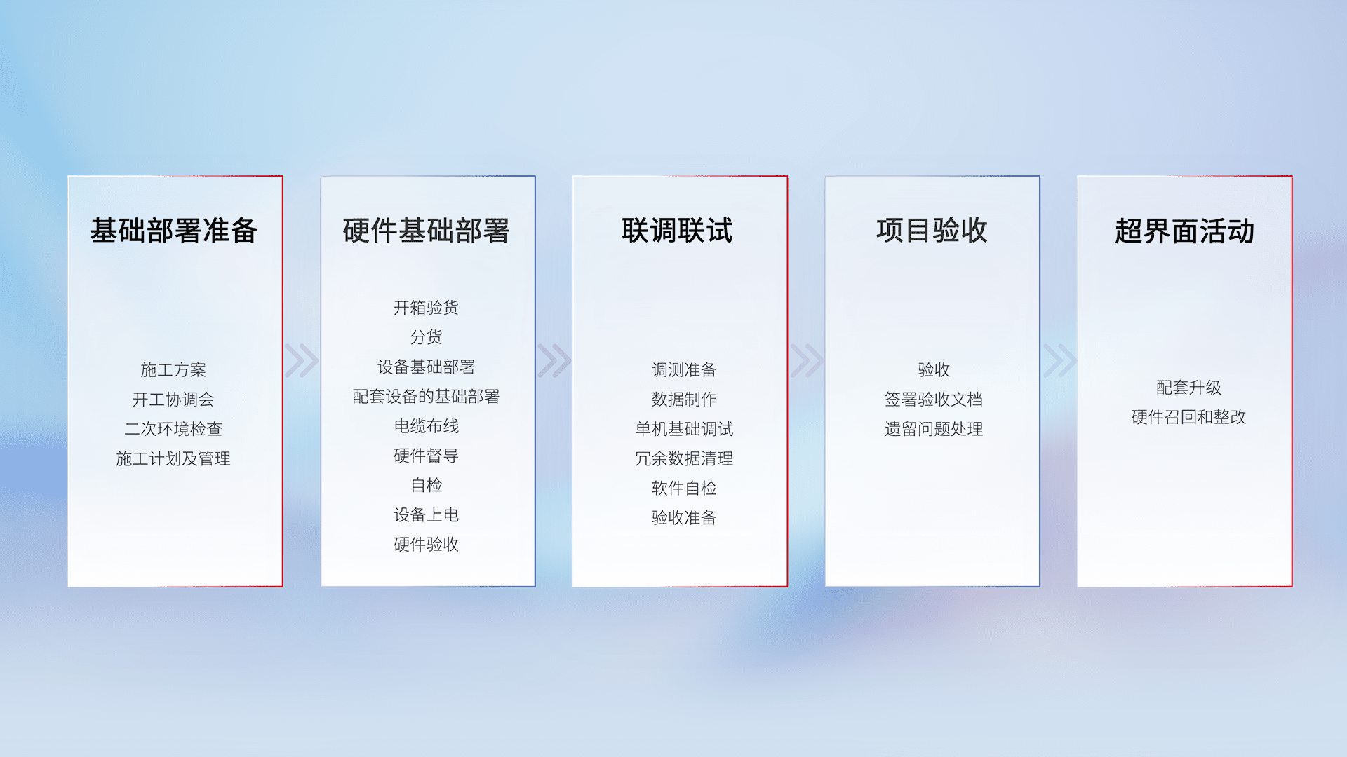 从基础部署准备、、、、硬件基础部署、、、联调联试、、、、项目验收、、、、越界面活动的全过程可追溯,,,保证施工质量和进度。。